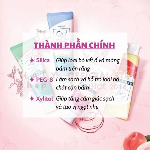 – Thành phần chính trong tuýp kem đánh trắng răng Ora 2 me Stain Clear 140g và Mild Stain Clear 125g Nhật gồm: