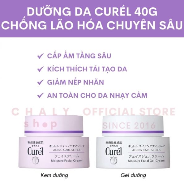 Dòng dưỡng Curel màu tím Aging Care Series của Kao Nhật Bản chống lão hoá gồm kem dưỡng Curel Kao và gel dưỡng Curel tím chuyên về cấp ẩm sâu, chống lão hoá với thành phần chủ chốt là Ceramide, chiết xuất từ gừng và glycerin