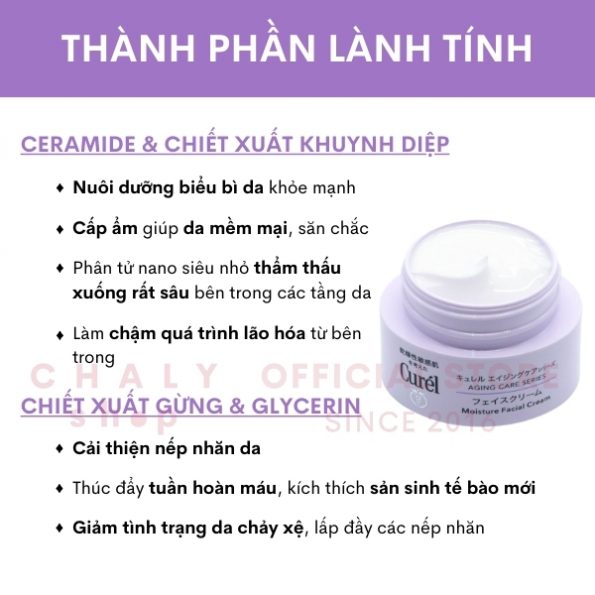 – Sản phẩm thuộc series Curel Aging Care chuyên về cấp ẩm sâu và chống lão hoá da của hãng mỹ phẩm Curel của Nhật – hãng chuyên các sản phẩm lành tính cho da nhạy cảm