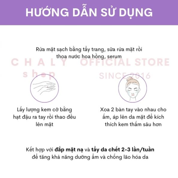 – Mục đích sử dụng: Cấp ẩm tầng sâu. Kích thích tái tạo da. Chống lão hoá. Giảm nếp nhăn