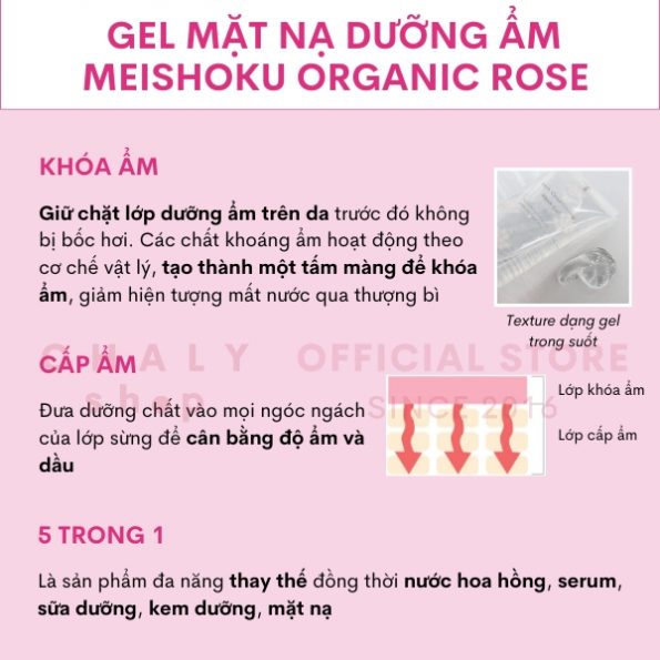 – Kem dưỡng Organic Rose cream màu hồng của Meishoku là sản phẩm kem dưỡng da đa năng, 5 in 1 thay thế đồng thời cho các bước cân bằng da – serum – sữa dưỡng – kem dưỡng – mặt nạ, giúp chị em chăm sóc da toàn diện, hiệu quả mà không tốn nhiều thời gian