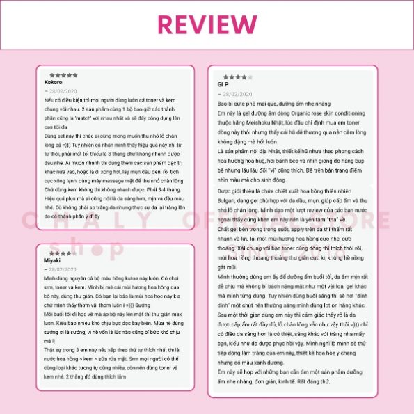 “Mình dùng nguyên cả bộ màu hồng kutoe này luôn. Có chai srm, toner và kem. Mình bị mê cái mùi hương hoa hồng của bộ này, dùng thư giãn. Có bạn lại bảo là mùi hoá học này kia chứ mình thấy thơm vãi thơm luôn í =))) Sướng