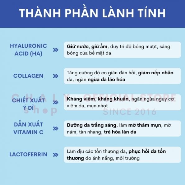 + Chiết xuất hatomugi (ý dĩ) nổi tiếng với công dụng kháng viêm, kháng khuẩn, ngăn ngừa nguy cơ viêm da, mụn nhọt. Đồng thời hatomugi extract còn là thành phần dưỡng trắng da có tiếng, giúp nuôi dưỡng làn da trong suốt, đều màu