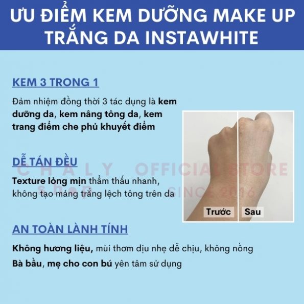 + Kem Instawhite tone up cream: Là kem dưỡng trắng da đơn thuần nên không gây hại da, ngược lại còn có tác dụng nuôi dưỡng da cực tốt không kém bất kỳ hũ kem dưỡng Nhật Bản nào. Cuối ngày chỉ cần sử dụng sữa rửa mặt là làm sạch hoàn hảo. Không gây bí lỗ chân lông, không gây mụn