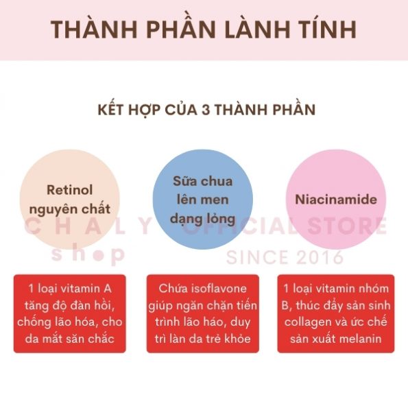 – Tóm lại, sự kết hợp hoàn hảo 3 thành phần niacinamide (vitamin B), loạt chiết xuất từ đậu nành và đặc biệt là pure retinol (vitamin A) giúp đem lại các tác dụng tuyệt vời sau cho vùng da quanh mắt