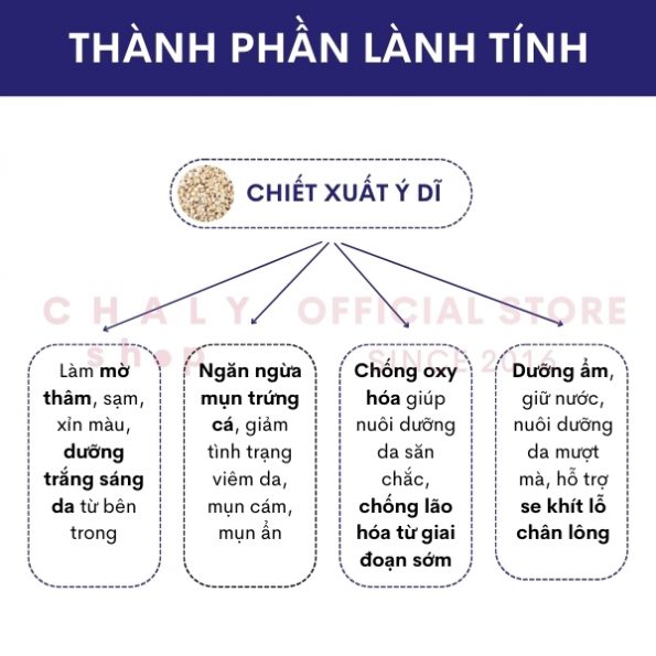 – Đồng thời, thành phần ý dĩ với ưu điểm giúp kháng viêm, kháng khuẩn còn hỗ trợ các vùng da viêm, kích ứng, mụn nhanh chóng dịu lại, mụn mau lặn hơn, và ngăn ngừa mụn trong tương lai