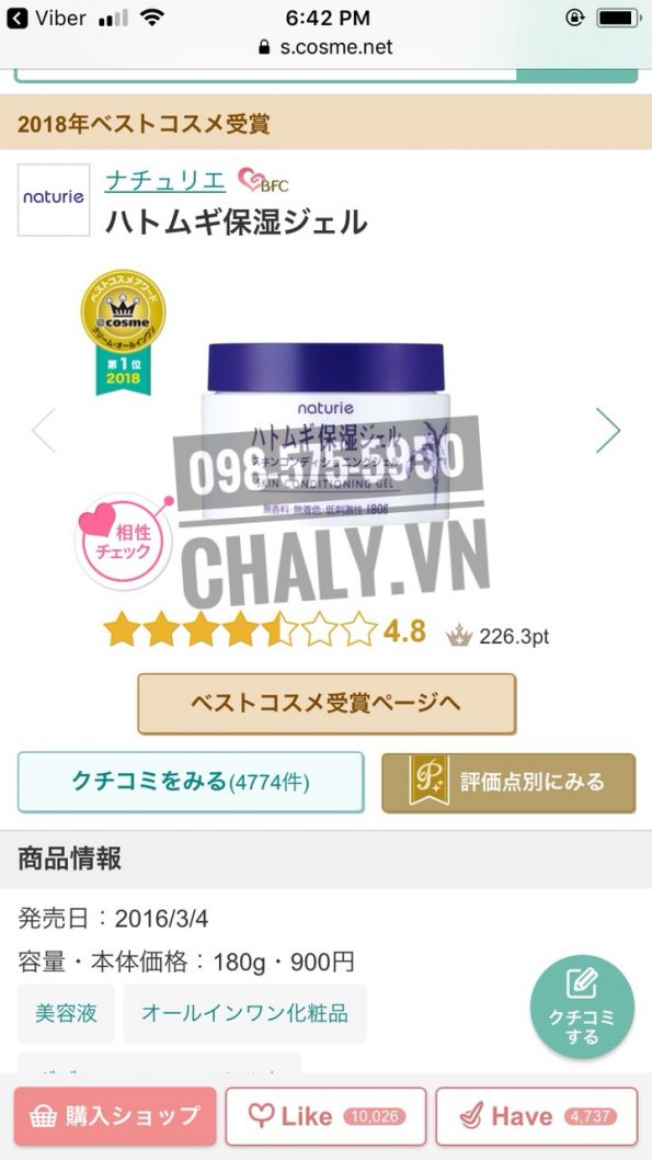 – Lotion ý dĩ này của Naturie cũng liên tục dẫn đầu trong list nước hoa hồng tốt nhất Nhật Bản tại chuyên trang Cosme