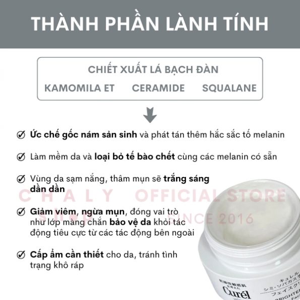 – Kem dưỡng Curel Nhật Bản trắng da có thành phần dưỡng trắng, làm mờ thâm sạm chính là kamomila ET