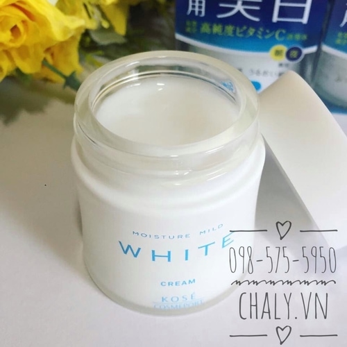 – Là kem dưỡng da mặt Nhật Bản không chứa cồn, Kose moisture mild white cream có thành phần lành tính không dầu khoáng, chất tạo màu, hương liệu