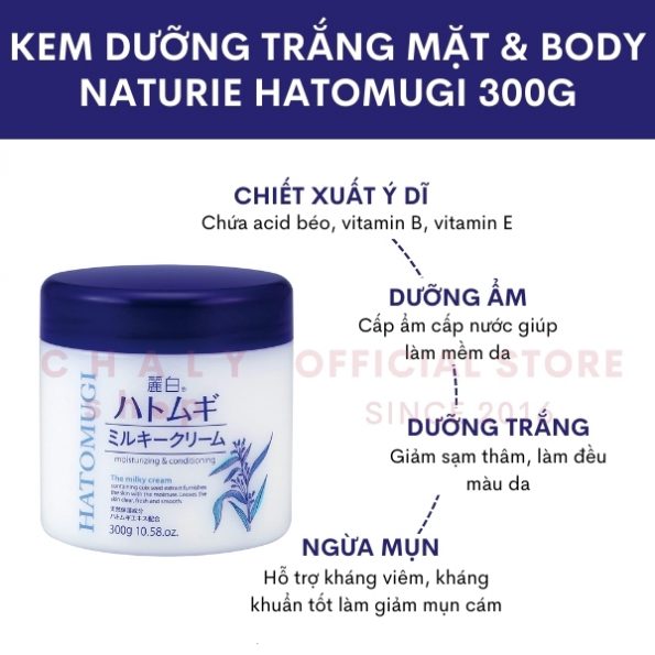 – Kem trắng da hatomugi 300g của Nhật là kem dưỡng đa năng, với 2 thành phần dưỡng da chủ yếu là chiết xuất hatomugi – còn gọi là tinh chất ý dĩ, và hyaluronic acid, cùng lúc thực hiện 2 công dụng cấp ẩm và dưỡng trắng