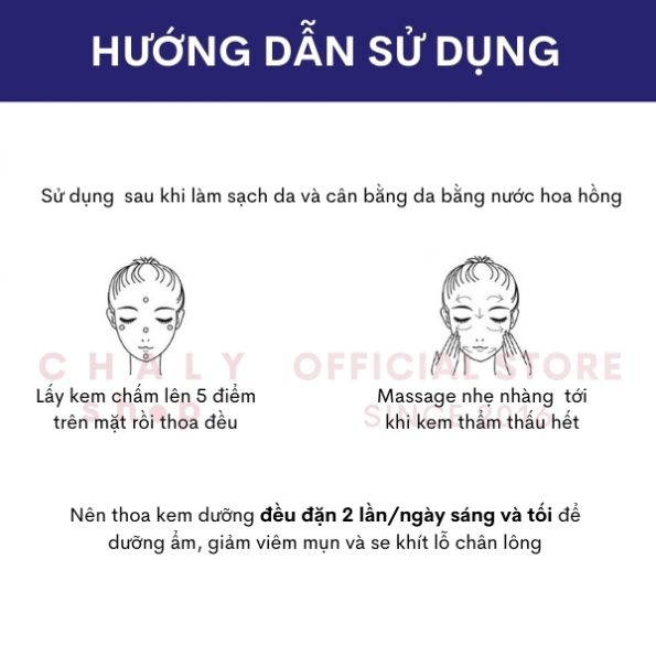 + Dùng như kem dưỡng trắng da mặt: Lấy lượng kem phù hợp thoa đều khắp mặt và cổ sau bước toner. Dùng ngày 2 lần sáng, tối