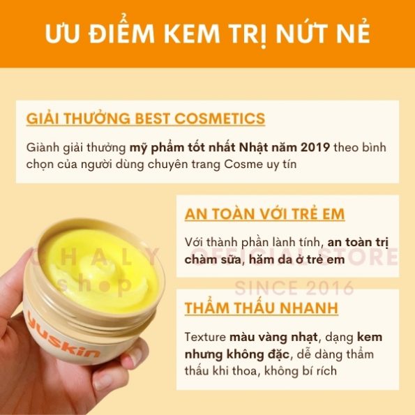 – Với ưu điểm thành phần lành tính, dịu nhẹ với làn da trẻ nhỏ, kem Yuskin a 120g được các bà mẹ Nhật yêu thích sử dụng làm kem trị nẻ cho bé, trị chàm sữa, hăm da cho trẻ em