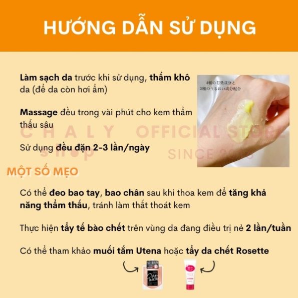 + Nhất thiết thực hiện tẩy tế bào chết toàn thân hoặc trên vùng da đang điều trị 2 lần mỗi tuần. Có thể sử dụng muối tắm Utena hoặc tẩy tế bào chết Rosette gommage gel đều được