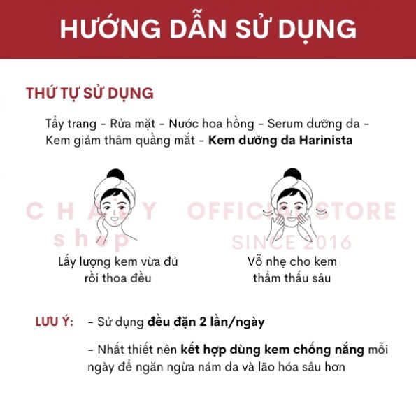 – Sau khi làm sạch da, lấy lượng kem dưỡng Harinista vừa đủ chấm lên 5 điểm trên mặt rồi thoa đều ra