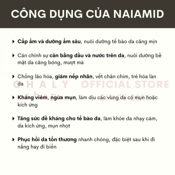 – Naiamid còn được gọi là nicotine amid (là một loại vitamin nhóm B) có tác dụng cân bằng và làm khoẻ da, phục hồi da rất hiệu quả. Sử dụng kem naiamid cream giúp kích thích tuần hoàn máu trên da, khiến các chất dinh dưỡng quý giá được thẩm thấu và đưa tới từng tế bào da nhanh chóng, từ đó phục hồi thương tổn, chữa lành các viêm, mụn, sạm sần cũng như những vùng da kích ứng