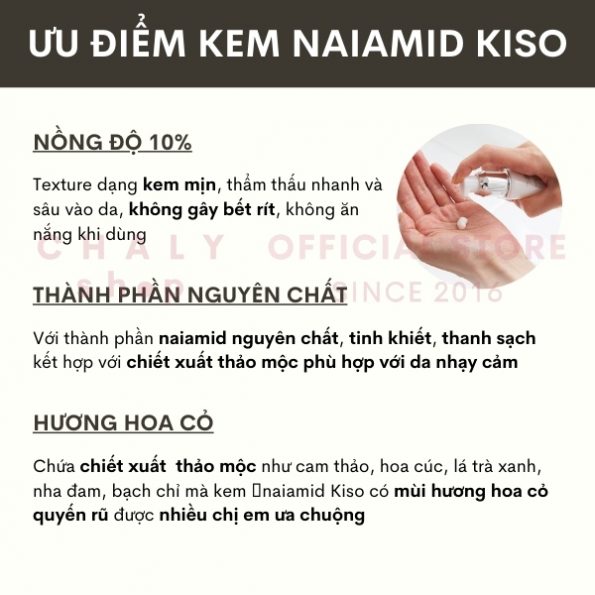 Ra đời bởi thương hiệu “nhỏ nhưng có võ” Kiso Care – thương hiệu tập trung vào nghiên cứu và sản xuất các sản phẩm serum/ tinh chất chăm sóc đặc biệt, đặc trị cho da, naiamid cream nổi lên bởi hiệu quả làm khoẻ da, giảm mụn viêm kích ứng hiệu quả trong thời gian ngắn chỉ với giá thành vô cùng mềm mại