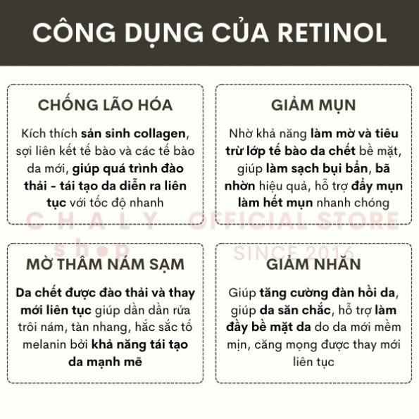 – Các công dụng chính mà retinol mang lại cho da gồm có