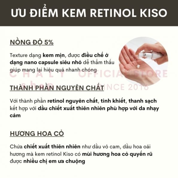 – Sản phẩm serum Kiso Care retinol cream với thành phần chính là retinol nồng độ cao 5%, được điều chế ở dạng nano capsule siêu nhỏ dễ thẩm thấu, giúp mang lại cho chị em những hiệu quả tuyệt vời sau khi sử dụng thường xuyên