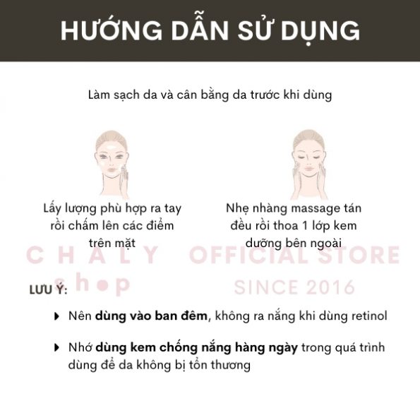 * Lưu ý không ra nắng sau khi sử dụng retinol. Vì vậy nên dùng vào ban đêm