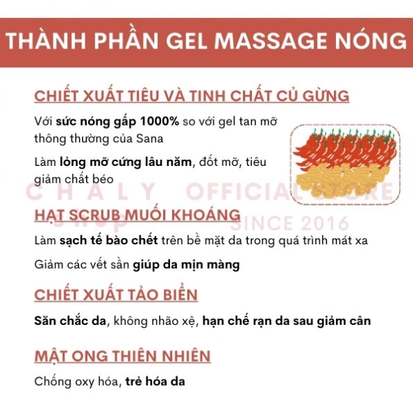 – Thành phần làm nóng đốt mỡ nguồn gốc từ thiên nhiên gồm có chiết xuất tiêu và tinh chất củ gừng với sức nóng gấp 1000% so với các gel tan mỡ thông thường của Sana giúp tăng tối đa hiệu quả của việc làm lỏng mỡ cứng lâu năm, đốt mỡ, tiêu giảm chất béo thêm rất nhiều lần