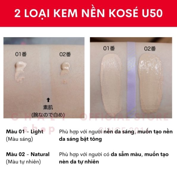 * Lưu ý: Theo nhiều review của người sử dụng, tone màu của kem nền đa năng Kose BB cream U50 có phần tối hơn so với các sản phẩm kem nền mà phụ nữ Việt Nam quen dùng. Do đó, đại đa số tone da phụ nữ Việt phù hợp với màu 01. Trừ phi da gốc sẫm màu, đen xỉn thì lựa chọn màu 02 mọi người nhé