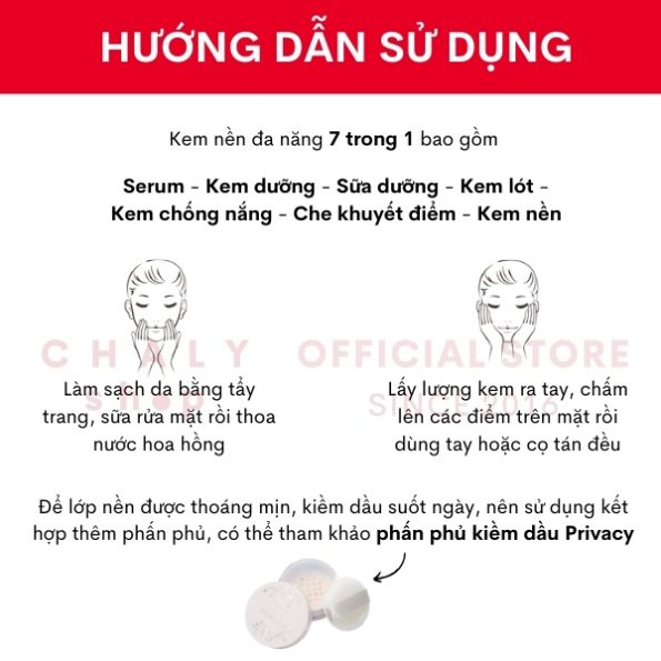 – Nếu muốn lớp nền da được thoáng mịn 24h hoặc kiềm dầu hơn nữa, có thể phủ một lớp phấn nền kiềm dầu Privacy lên trên cùng