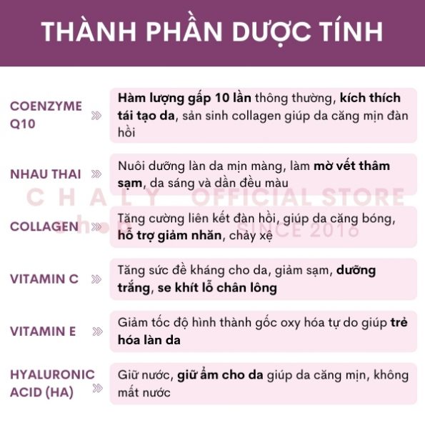 – Thành phần dược tính (medicated ingredients) có khả năng cân chỉnh làn da gốc collagen và nhau thai placenta