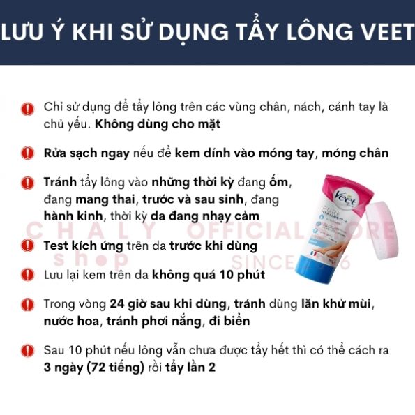 – Không nên lưu lại kem tẩy lông Veet Nhật Bản trên da quá 10 phút