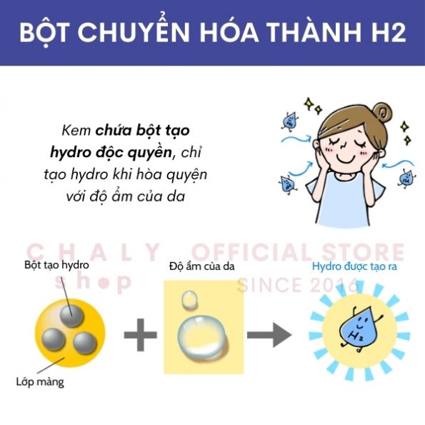 – Kem nám H2 skin spot cream Nhật Bản mang trong mình 1 thành phần độc đáo là bột chuyển hoá, có khả năng biến thành H2 (hydro) khi kết hợp cùng nước trong cơ thể