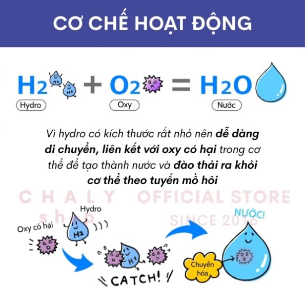 + Tiếp đó, H2 này sẽ bắt lấy các phân tử O2 hoạt tính đã nhắc tới ở phía trên, kết hợp cùng chúng trở thành H2O – nước – hoàn toàn vô hại đối với cơ thể