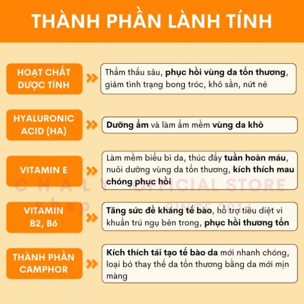 + Thành phần camphor giúp kích thích tái tạo tế bào da mới nhanh chóng hơn, dần dần loại bỏ và thay thế da tổn thương bằng làn da mới mịn màng, sáng hồng
