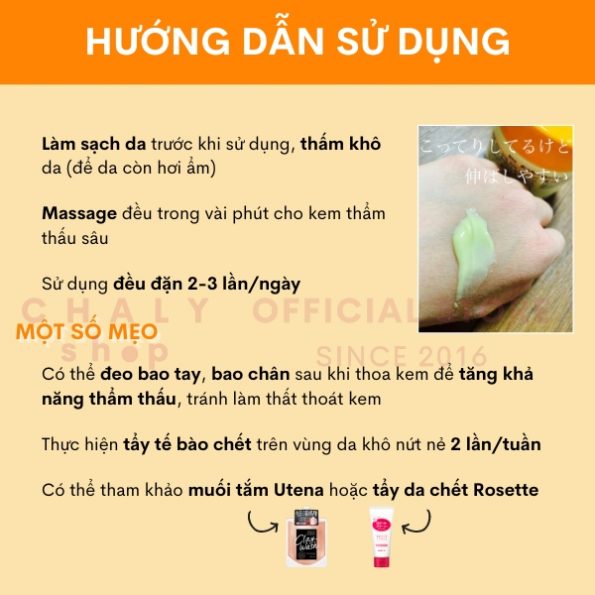 – Để đạt hiệu quả nhanh chóng, nên kết hợp dùng kem trị nứt nẻ da tay chân Rohto Nhật Bản với việc tẩy da chết toàn thân hoặc dùng muối tắm body thường xuyên để làm mềm và sạch da tốt hơn trước khi thoa kem