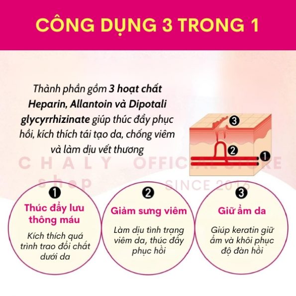 – Công dụng 3 trong 1: Nhanh phục hồi vết thương + Ngăn ngừa sẹo mới + Nuôi dưỡng da mịn màng