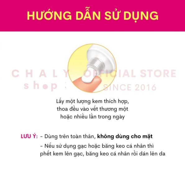 – Lưu ý cần làm sạch vùng vết thương trước khi thoa kem. Không thoa trực tiếp lên vết thương hở. Khi vết thương hở bắt đầu kéo kín miệng là thời điểm thích hợp để sử dụng