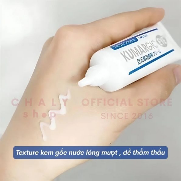 – Kem mắt Kumargic eye 20g có texture kem lỏng gốc nước, không bết dính khi thoa lên mắt
