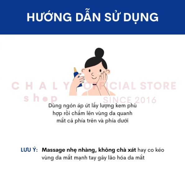 Cách thực hiện: dùng 1 lượng vừa đủ massage cho phần mắt dưới từ 2-3 phút rồi để kem tự thấm. Hoàn toàn không ảnh hưởng đến quá trình skincare routine hàng ngày của mọi người nha.