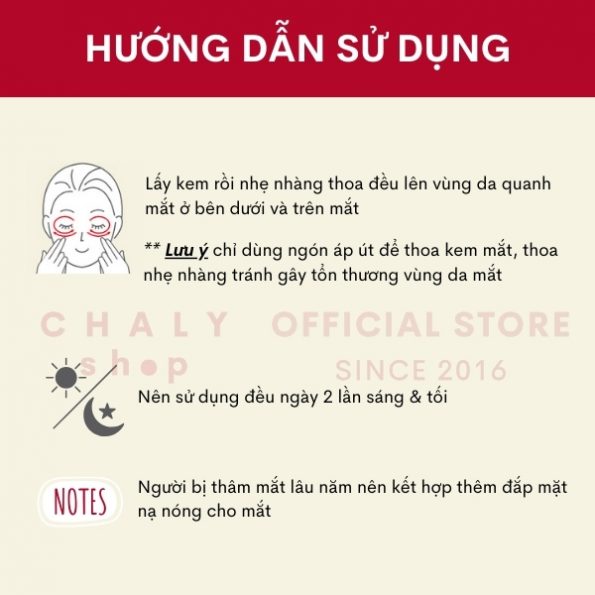 * Lưu ý chỉ dùng ngón áp út để thoa kem mắt, thoa nhẹ nhàng tránh gây tổn thương da vùng mắt