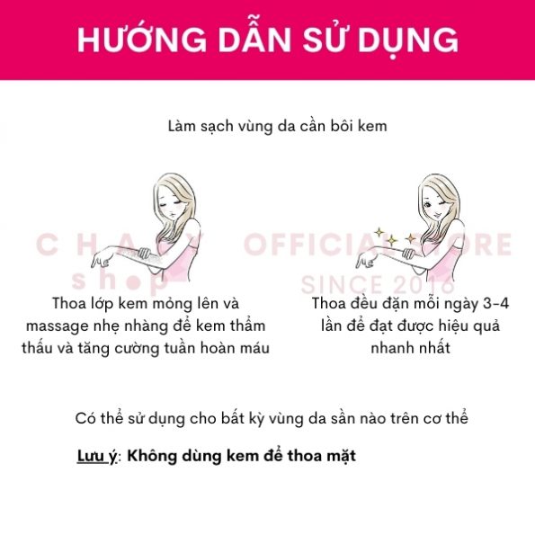 – Làm sạch vùng da cần dưỡng. Sau đó thoa một lớp kem mỏng lên và massage nhẹ nhàng để kem thẩm thấu cũng như tăng cường thêm tuần hoàn máu