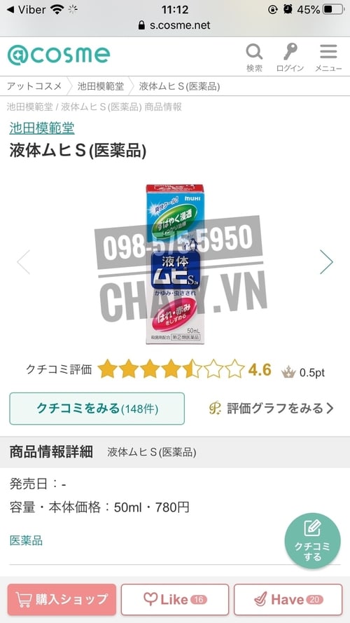 – Kem trị muỗi đốt Muhi Nhật review cao trên Cosme ranking với số điểm 4.6, hàng trăm đánh giá