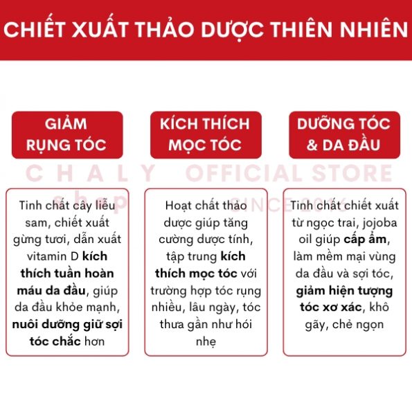 – Thành phần dưỡng gồm một loạt hoạt chất từ thiên nhiên và thảo dược, đã qua nghiên cứu hiệu quả với việc giảm rụng và kích thích tuần hoàn máu da đầu, kích thích quá trình sản sinh sợi tóc mới tốt như tinh chất cây liễu sam, chiết xuất gừng tươi Nhật Bản cùng dẫn xuất Vitamin D và một số thành phần khác