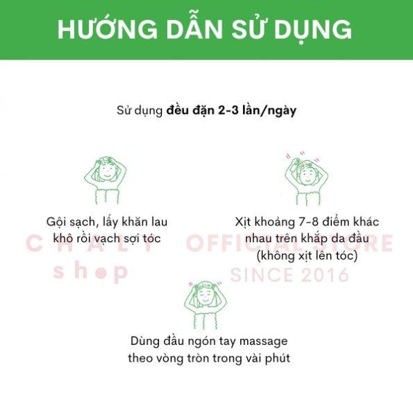 – Xịt lên khoảng 7-8 điểm khác nhau trên khắp da đầu, sau đó dùng các đầu ngón tay để massage theo hình vòng tròn trong vài phút