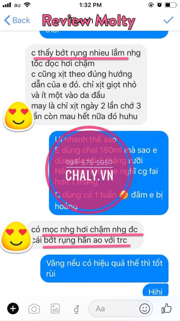 Lúc mới sinh em bé xong tóc mình rụng lả tả kinh hoàng tới mức mình phát khiếp, tưởng muốn trọc cái đầu luôn. Tìm hiểu mãi mới tìm được loại xịt molty này có vẻ hiệu quả. Ban đầu mình mua màu hồng thấy có tác dụng rồi nhưng hơi chậm, nên quyết định chuyển sang molty màu đỏ xem thế nào. Quả đúng là tiền nào của nấy, màu đỏ hiệu quả nhanh hơn hẳn