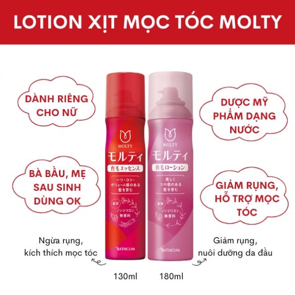 – Đặc biệt lotion xịt trị rụng tóc Molty rất phù hợp để giảm rụng tóc, kích thích mọc tóc cho phụ nữ rụng tóc sau sinh hoặc mang thai, rụng tóc do thay đổi nội tiết tố