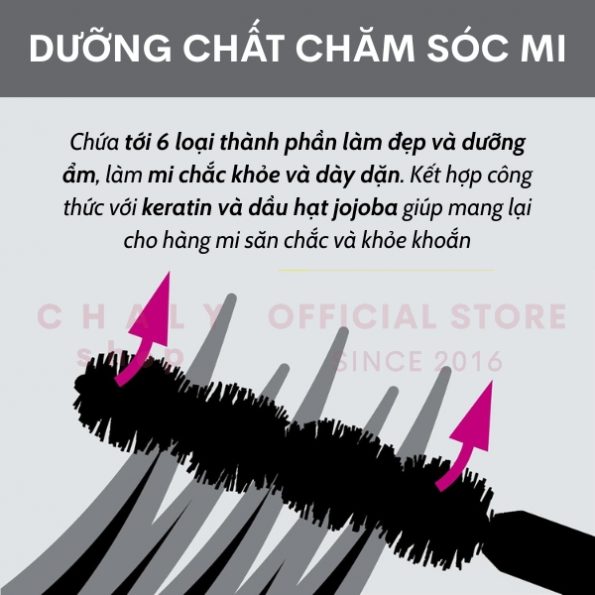 – Chứa tới 6 loại thành phần làm đẹp và dưỡng ẩm, làm mi chắc khỏe và dày dặn. Kết hợp công thức với keratin và dầu hạt jojoba giúp mang lại cho hàng mi săn chắc và khỏe khoắn