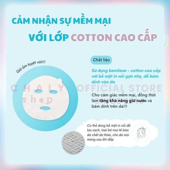 “Cấp ẩm rất tốt, mask này chỉ cần đắp 8-10′ là okela rồi. Chất mask cotton dày nên giữ được tinh chất đỡ bị bay hơi. Mặc dù dày nhưng đắp lên không cảm thấy bị châm chích hay rát mà rất êm và mịn. Đắp xong thì nên massage một lúc rồi lau nhẹ qua toner, không cần phải rửa qua nước”