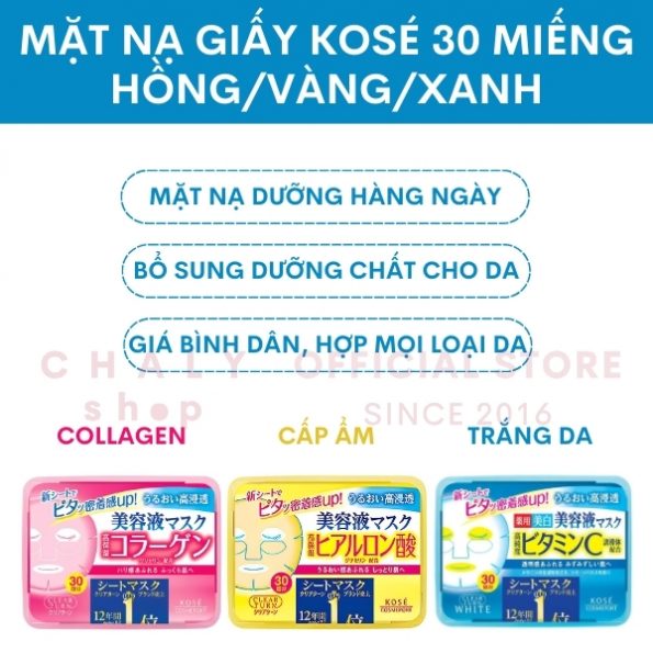 – Mặt nạ collagen Kose 30 miếng giúp trẻ hoá làn da, phù hợp với chị em trên 25 tuổi