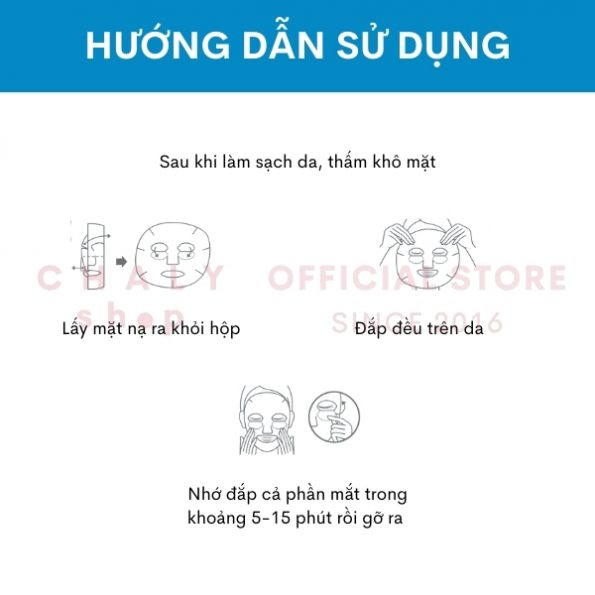 – Để mặt nạ trong vòng 5-15 phút trên da (tối đa 15 phút), sau đó gỡ ra và vỗ nhẹ để dưỡng chất thẩm thấu hết