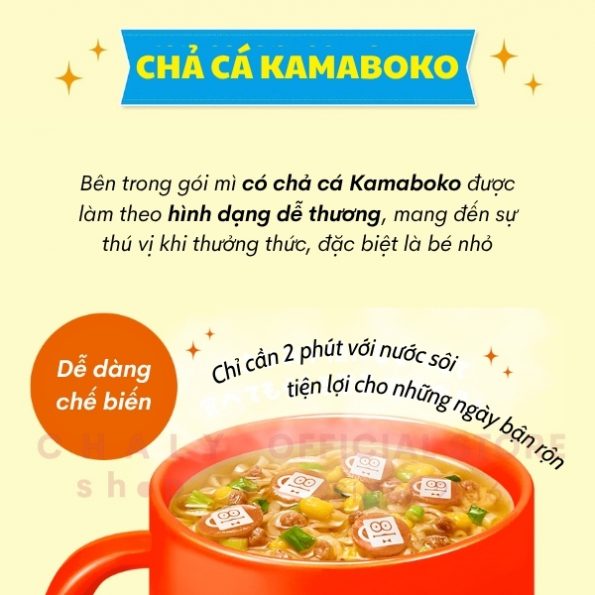Bên trong gói mì có chả cá Kamaboko được làm theo hình dạng dễ thương, mang đến sự thú vị khi thưởng thức, đặc biệt là bé nhỏ. Gồm 2 vị hấp dẫn: thịt heo gà hầm nước tương và vị hải sản, phù hợp cho cả trẻ em (từ 3 tuổi) và người lớn ăn xế