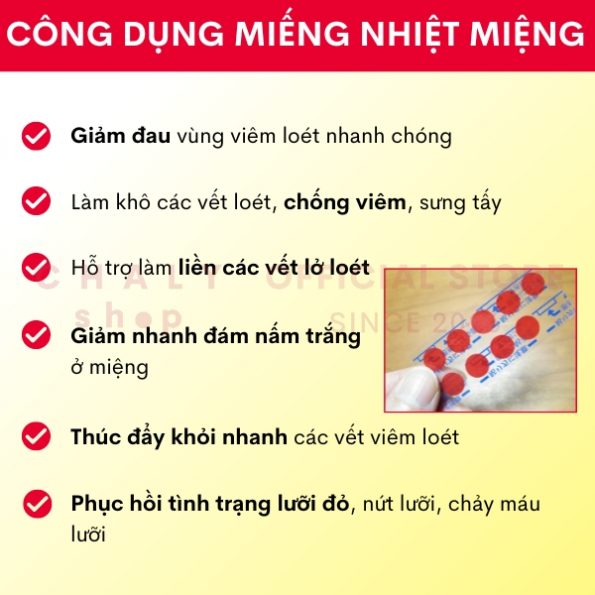 – Miếng dán nhiệt miệng của Nhật có thành phần thuốc trị nhiệt miệng trực tiếp tiếp xúc với vùng miệng viêm lở, thúc đẩy quá trình tiêu diệt vi khuẩn có hại và chữa lành vết thương
