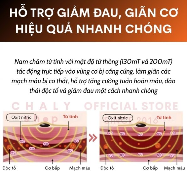 – Nhờ từ trường phát ra từ các hạt nam châm, miếng dán giảm đau sẽ tác động trực tiếp vào vùng cơ bị căng cứng, làm giãn các mạch máu bị co thắt, hỗ trợ tăng cường tuần hoàn máu, đào thải độc tố và giảm đau một cách nhanh chóng
